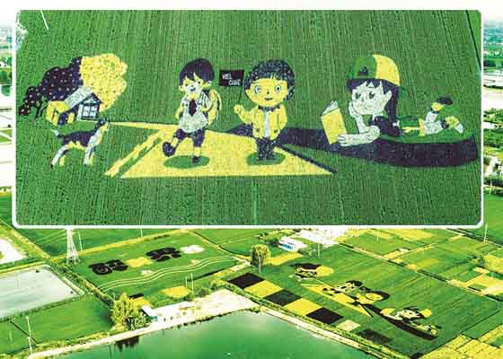 秋季是收獲季節(jié),界首鎮(zhèn)運河大橋腳下試種的彩色水稻圖案形象生動,充分展現(xiàn)了當(dāng)?shù)鼐G色生態(tài)的田園風(fēng)光。